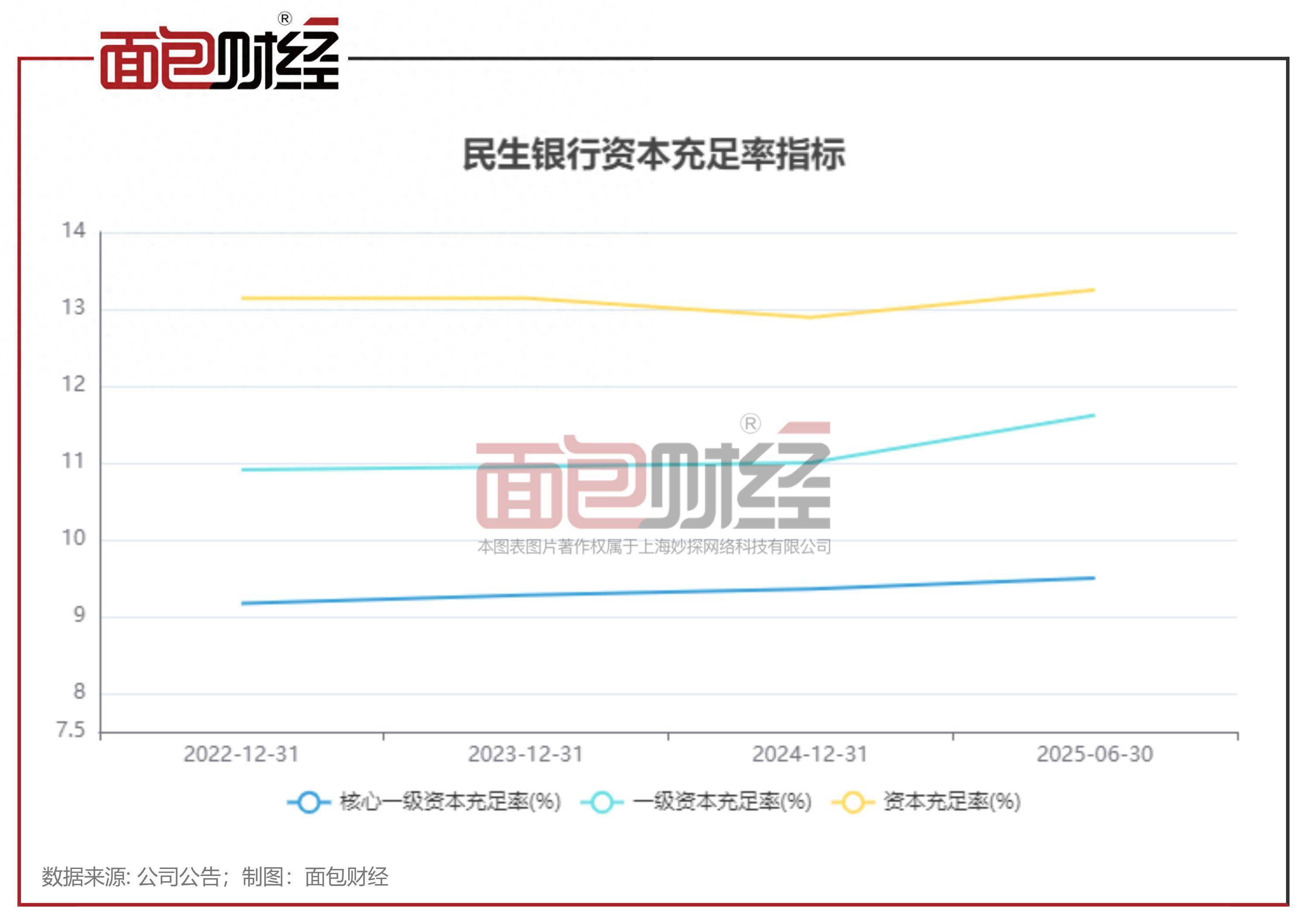资本金的有效补充使得民生银行的各项资本充足率指标均有明显提升。数据显示,截至2025年6月末,该行核心一级资本充足率、一级资本充足率、资本充足率分别为9.50%、11.62%和13.25%,较上年末分别提升0.14、0.62和0.36个百分点。